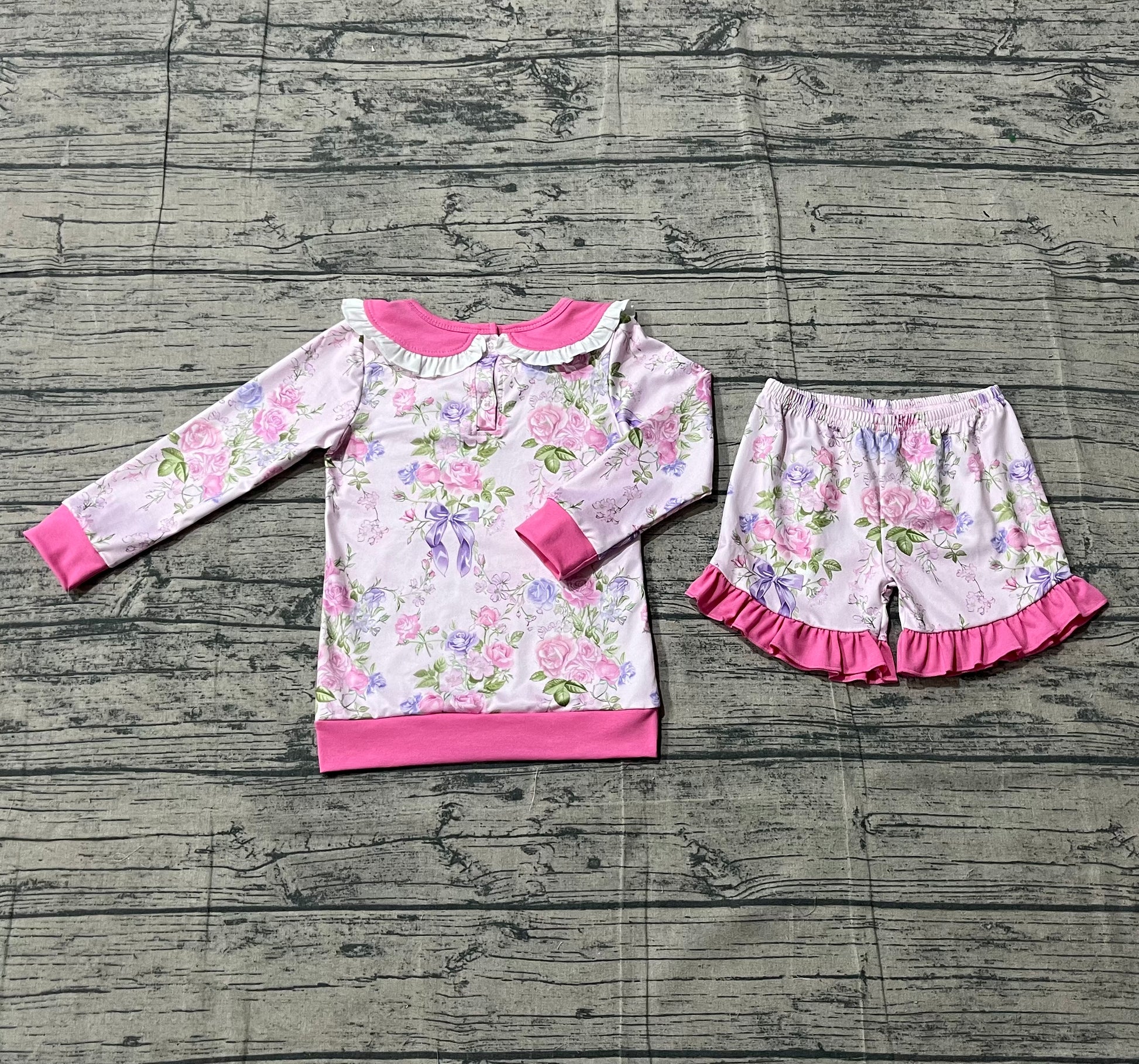 pre order pink flower with bow long sleeve shorts set