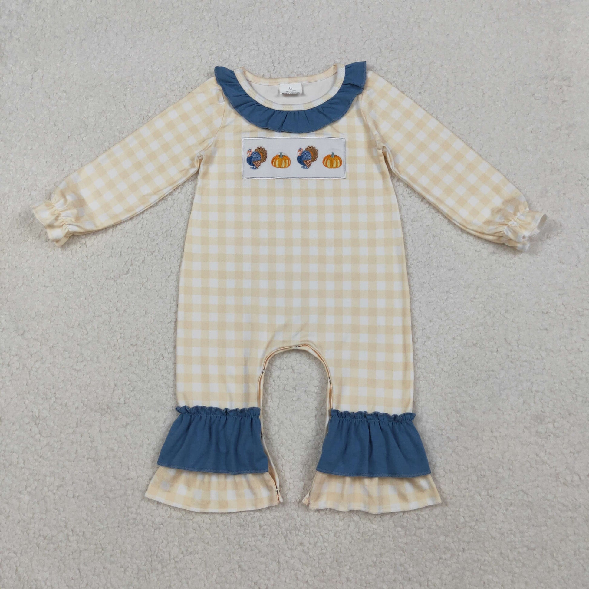 Thanksgiving day gingham turkey embroidery baby girl romper